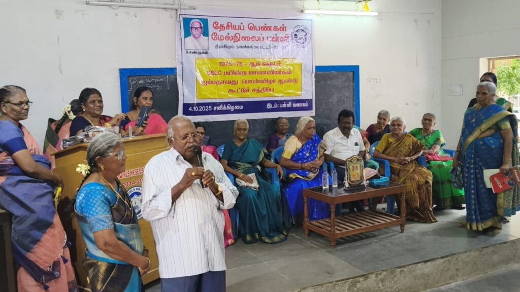 ராசிபுரம் தேசிய பெண்கள் மேல்நிலைப்பள்ளியில் கடந்த 50 ஆண்டுகளுக்கு முன் பயின்ற முன்னாள் மாணவியர் சந்திப்பு நிகழ்ச்சி சனிக்கிழமை நடைபெற்றது. ராசிபுரம் தேசிய பெண்கள் மேல்நிலைப்பள்ளியில் கடந்த 1975-76-ம் ஆண்டு பயின்ற மாணவியர் 45 பேர் பொன்விழா ஆண்டையொட்டி பள்ளியின் ஒன்று கூடி மாணவப் பருவத்தை நினைவு கூர்ந்து மகிழ்ந்து கொண்டாடினர்.