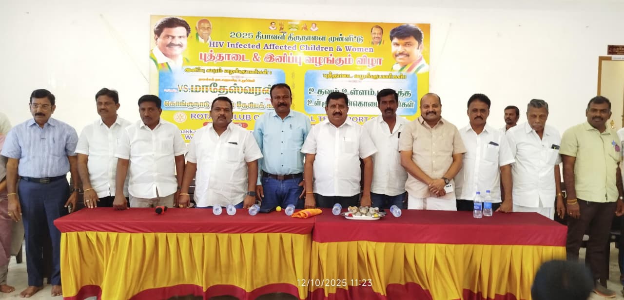 நாமக்கல் HIV Welfare Association சார்பில் நாமக்கல் தீரன் சின்னமலை மாளிகையில் நடைபெற்ற விழாவில் நாமக்கல் எம்பி., வி.எஸ்.மாதேஸ்வரன் சொந்த நிதியில் தீபாவளி பண்டிகையை தொடர்ந்து இனிப்பு வழங்கும் நிகழ்வு நடைபெற்றது. இதில் கொங்குநாடு மக்கள் தேசிய கட்சியின் மாநில விவசாய அணி இணை செயலாளர் D.S.சந்திரசேகர் தலைமையில் எச்ஐவி பாதிக்கப்பட்ட 270 பேருக்கு இனிப்புகள் மற்றும் புத்தாடைகள் வழங்கப்பட்டது.