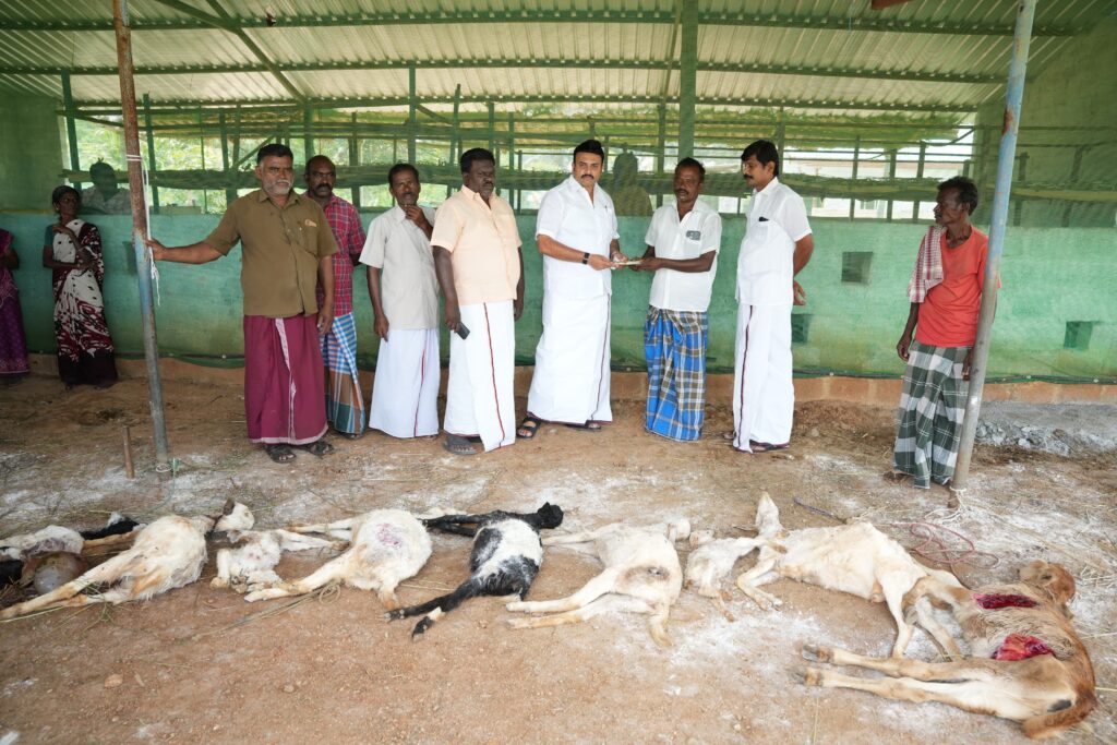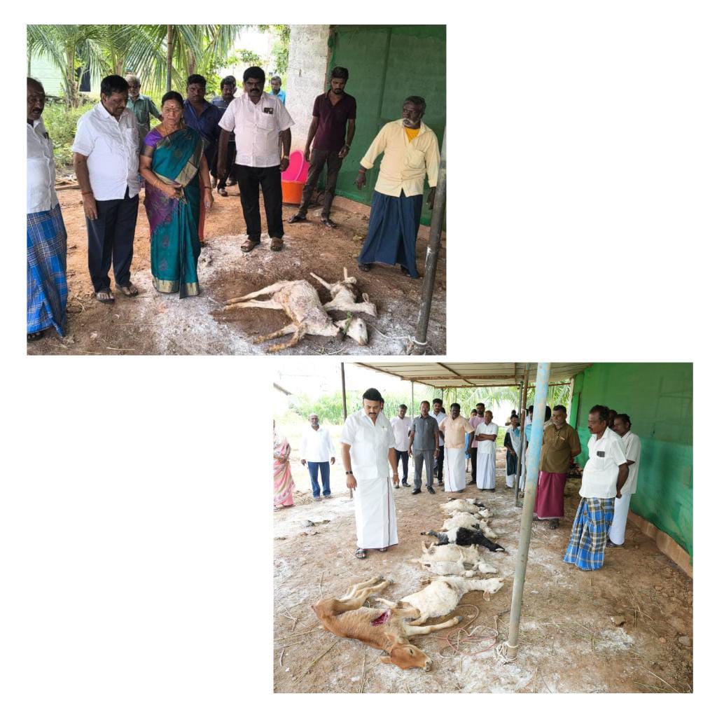 இவர் ஞாயிற்றுக்கிழமை இரவு வழக்கம் போல் ஆடுகளை கொட்டடையில் அடைத்து விட்டு சென்றுள்ளார். பின்னர் திங்கள்கிழமை அதிகாலை எழுந்து பார்த்தபோது வீட்டின் எதிரே வளர்ப்பு ஆடுகள் வெறிநாய்களால் குதறப்பட்டு உயிரிழந்து கிடந்தன. இதனையடுத்து தமிழக ஆதிதிராவிடர் மற்றும் பழங்குடியினர் துறை அமைச்சர் மா.மதிவேந்தன், முன்னாள் அமைச்சர் வி.சரோஜா ஆகியோர் தனி தனியாக விவசாயியின் தோட்டத்துக்கு சென்று உயிரிழந்த ஆடுகளை பார்வையிட்டு விவசாயிக்கு ஆறுதல் கூறி நிவாரண உதவிகள் வழங்கினர். மேலும் பாதிக்கப்பட்ட விவசாயிக்கு அரசின் உதவிகள் பெற்றுத்தருவதாக உறுதியளித்தார்.
