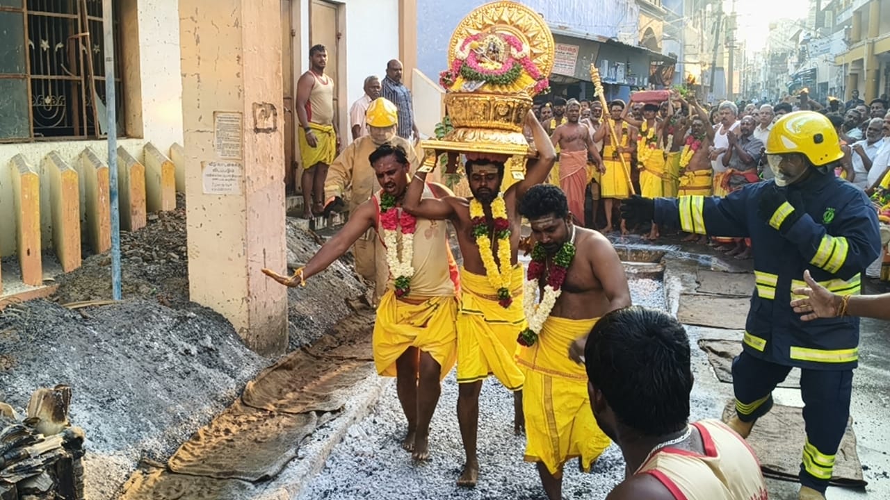 இதனையடுத்து செவ்வாய்க்கிழமை அதிகாலை அக்னி குண்டம் பற்றவைத்தல் நிகழ்ச்சியும் தொடர்ந்து சுவாமி ஊஞ்சல் உற்சவம் நடைபெற்றது. திருவிழாவின் முக்கிய நிகழ்வான தீமிதி திருவிழாவில் முன்னதாக கோவில் பூசாரிகள் தீக்குண்டம் இறங்கிட திரளான பக்தர்கள் தீமித்து நேரித்தி கடன் செலுத்தினர்.