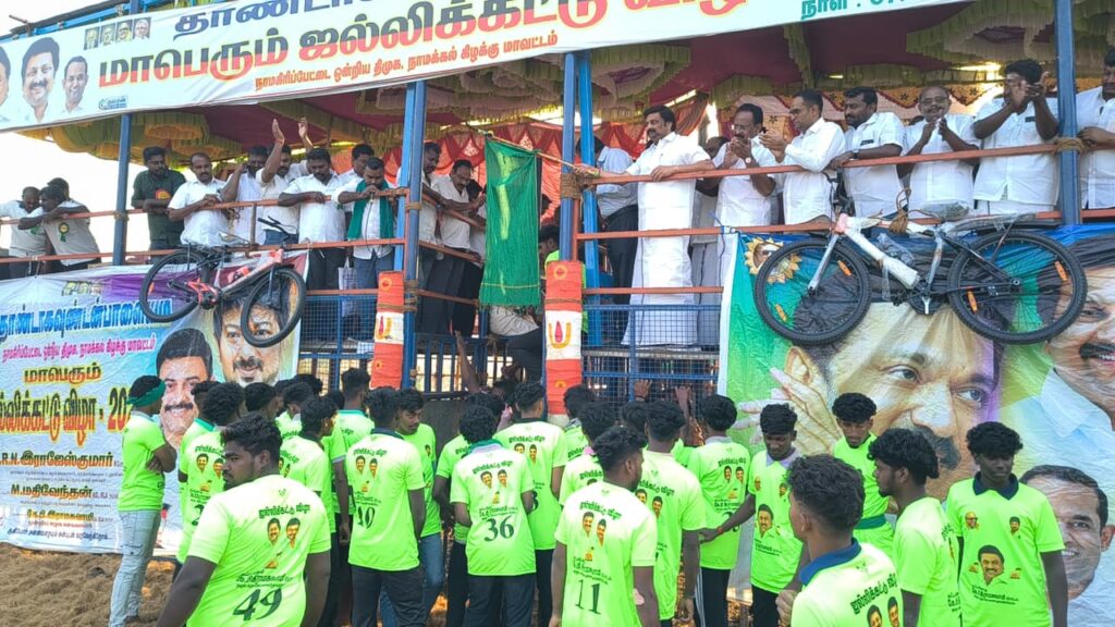 ராசிபுரம் அருகேயுள்ள மங்களபுரம் தாண்டாகவுண்டம்பாளையம் பகுதியில் நாமக்கல் மாவட்ட நிர்வாகம் அனுமதியுடன் ஜல்லிக்கட்டு போட்டி நடைபெற்றது.