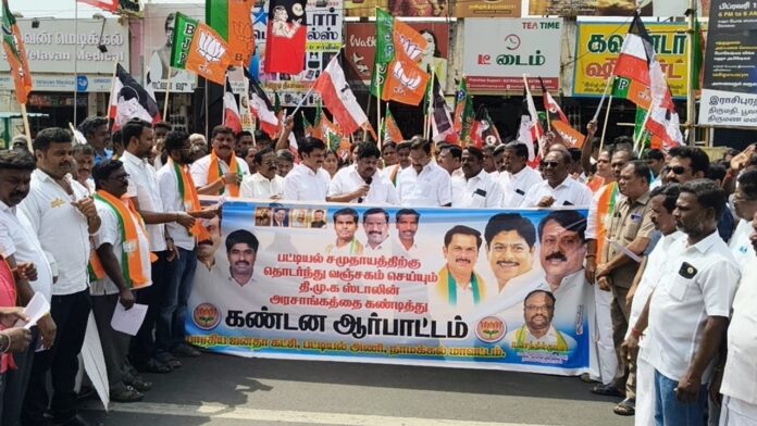 ராசிபுரம் புதிய பேருந்து நிலையம் அருகே நடைபெற்ற இந்த கண்டன ஆர்ப்பாட்டத்தில் நாமக்கல் மாவட்ட பாஜக பட்டியலின மாவட்ட தலைவர் ஆர்.பி. தமிழரசு தலைமை வகித்தார். சிறப்பு அழைப்பாளர்களாக, பாஜக மாநிலத் துணைத் தலைவர்கள் டாக்டர் கே.பி.ராமலிங்கம், வி.பி.துரைசாமி ஆகியோர் பங்கேற்றனர்.