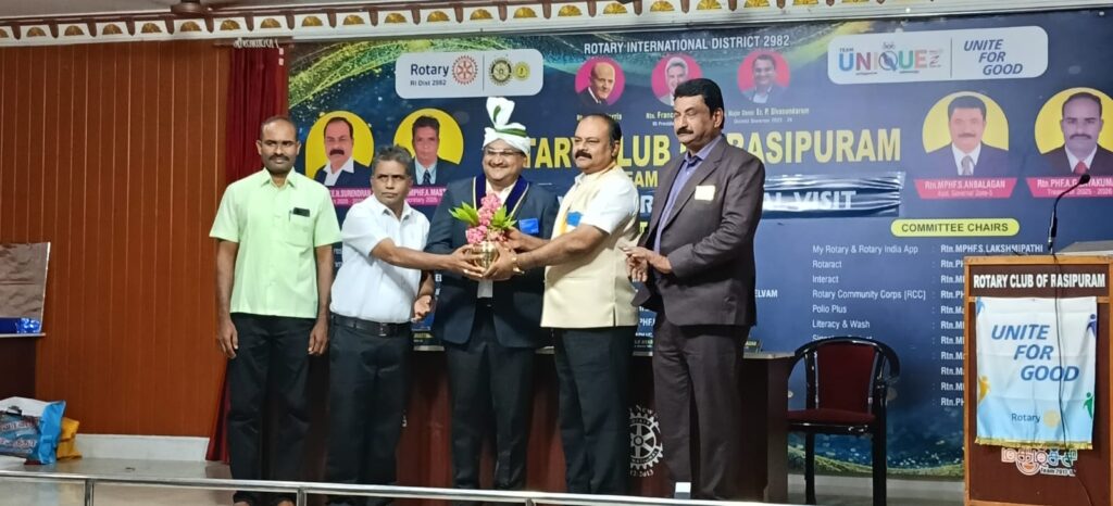 ராசிபுரம் ரோட்டரி சங்கம் சார்பில் ரோட்டரி மாவட்ட ஆளுநர் அலுவல் முறை வருகை விழா புதன்கிழமை நடைபெற்றது. இதனை தொடர்ந்து முன்னதாக நடைபெற்ற விழாவில், ஸ்ரீநித்திய சுமங்கலி மாரியம்மன் கோவிலில் ரோட்டரி ஆளுநர் பி.சிவசுந்தரத்திற்கு பூர்ண கும்பமரியாதை வழங்கப்பட்டு வரவேற்பு அளிக்கப்பட்டது.