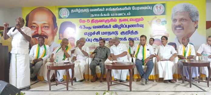 தமிழ்நாடு வணிகர் சங்கங்களின் பேரமைப்பின், 43வது வணிகர் விழிப்புணர்வு எழுச்சி மாநாடு திருவாரூரில் மே.5-ல் நடைபெறுகிறது. இது குறித்த சிறப்பு ஆலோசனை கூட்டம், நாமக்கல்லில் நடந்தது. பேரமைப்பின், நாமக்கல் மாவட்ட தலைவர் த.ஜெயக்குமார் வெள்ளையன் தலைமை வகித்தார். பேரமைப்பின் மாநில தலைவர் விக்கிரமராஜா கூட்டத்தில் கலந்துகொண்டு பேசினார். பின்னர் அவர் செய்தியாளர்களிடம் கூறியதாவது: