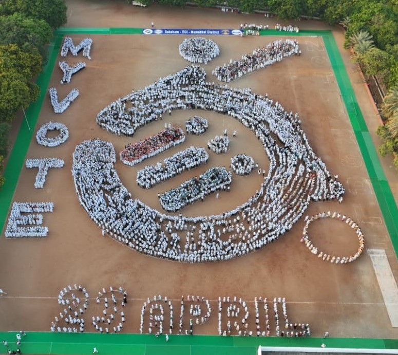 இதனை தொடர்ந்து மாவட்ட தேர்தல் அலுவலரும், மாவட்ட ஆட்சியருமான துர்காமூர்த்தி தலைமையில் பாச்சல் பாவை பொறியியல் கல்லூரி மைதானத்தில் தமிழக சட்டமன்ற பொது தேர்தல் 2026 இல் 100 சதம் வாக்குப்பதிவை உறுதி செய்யும் வகையில் சுமார் அரசு அலுவலர்கள், பணியாளர்கள், கல்லூரி பேராசிரியர்கள், மாணவ மாணவியர்கள் என 8662 நபர்கள் தேர்தல் விழிப்புணர்வுச் சின்னத்தின் மிகப்பெரிய மனித வடிவமான மாற்றுத்திறனாளிகள் மொபைல் செயலி, என் வாக்கு விற்பனைக்கு அல்ல, ஏப்ரல்-23 என ஆங்கில எழுத்திலான ஓவியங்கள் வடிவில் ஒரு சேர அமர்ந்து விழிப்புணர்வு ஏற்படுத்தினர்.